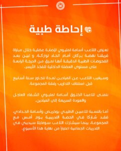 فيما يُنتظر أن يلتحق اللاعب سومايلا سيديبيدي بالتدريبات الجماعية اعتبارا من نهاية هذا الأسبوع، ليكتمل بذلك جاهزية الفريق تدريجيا.